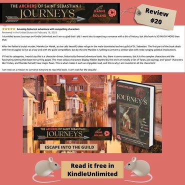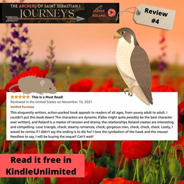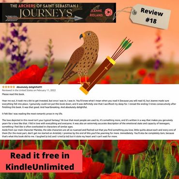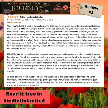This was a fabulous book! As other reviewers have said, I couldn’t put it down. All of the characters were so well-drawn and distinctive, and likeable in an imperfect way. This story has it all--a heroine to root for, intrigue, romance, humor, archery, and swoon-worthy boys. What more could you ask for, besides more from Jeanne Roland?